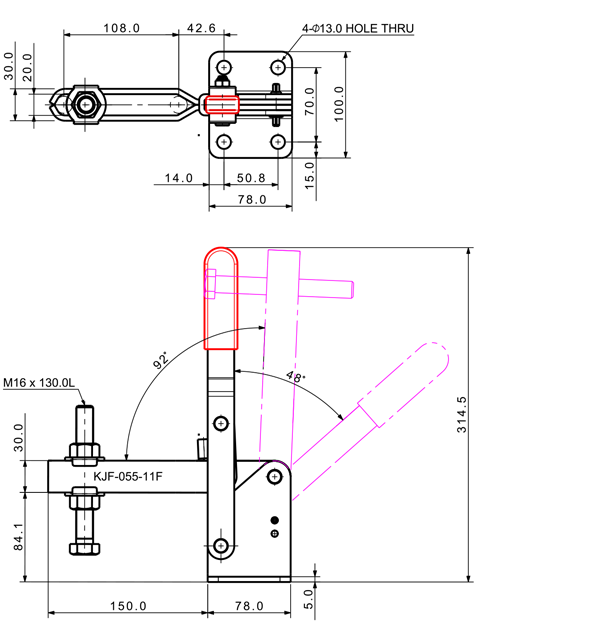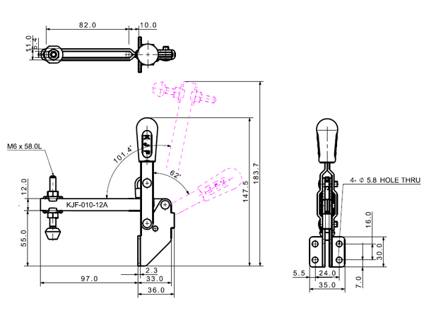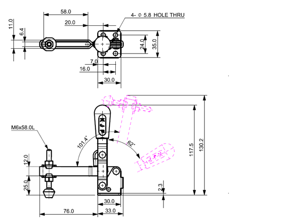 100 185 62˚ 101˚ M6 x 58.0L 82 U Long Flange Low